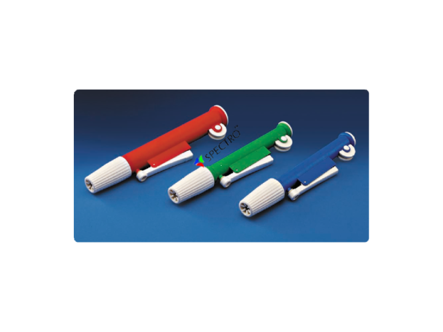 PL presents a fast release pipetting device for precise pipetting & zip quick emptying. The Knurled thumbwheel can be rotated to draw up or dispense liquids while the releaser may be pushed in for zip-quick emptying. The moulded chuck has a silicon rubber collet inside to hold various pipettes of standard sizes. It resists acids & alkalis and can be easily disassembled for thorough cleaning
