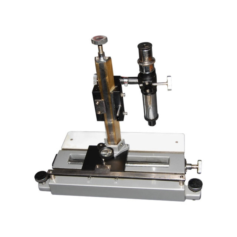 The instrument consists of a high-resolution microscope mounted on a movable carriage that travels along a graduated scale. It is equipped with fine adjustment screws for precise positioning and accurate readings. The sturdy base and smooth sliding mechanism ensure stability and ease of use during experiments.